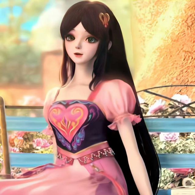一位长着黑色长发的女孩穿着粉红色连衣裙坐在花园里的长椅上, 长发,连衣裙,发饰,坐着,心形发饰,黑发,粉色连衣裙,长椅,棕色头发,蓬松袖子,短袖