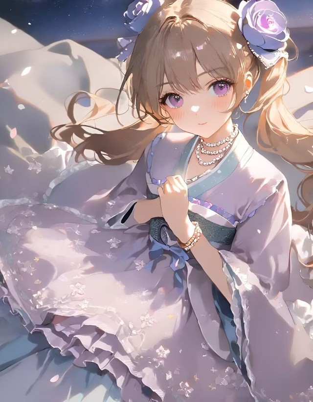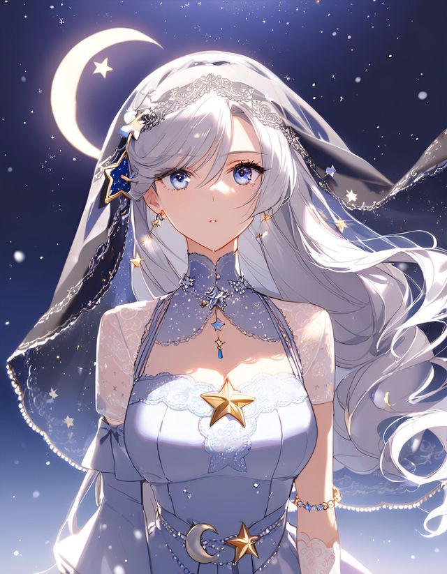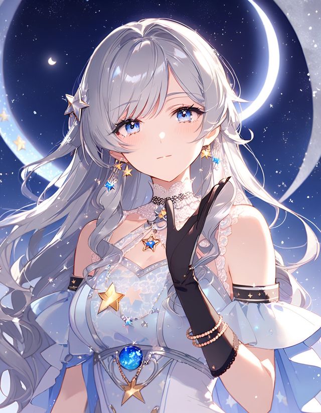 兮昭玥样貌:一头微卷的银色长发垂至腰间,冰蓝色眼眸澄澈深邃(动用神权时会变成一冰蓝一淡紫的异色瞳)。身着西欧风服饰,融入月亮和星星元素,脚下是高跟水晶鞋或黑色高跟长靴。左手戴着水晶手镯,套着至大臂的白色蕾丝手套。