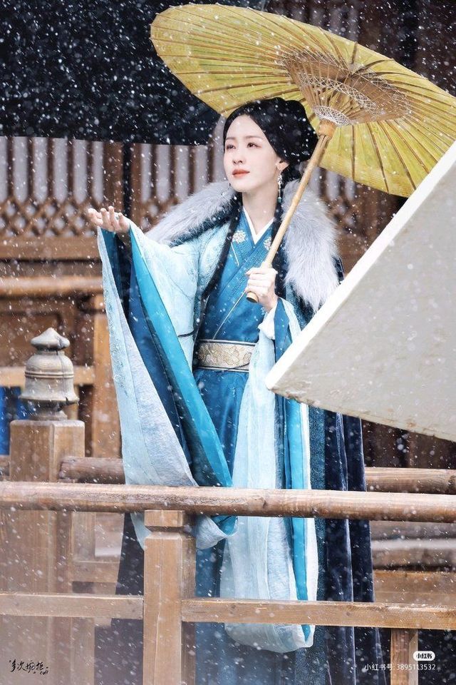 庭内鹅雪纷飞,一身蓝衣女子纤弱的身形站在栏边,一手撑着一把伞,抬起胳膊用手接住一片又一片雪花,那露出的皓腕白皙又细瘦,仿佛轻轻一折便能折断似的。