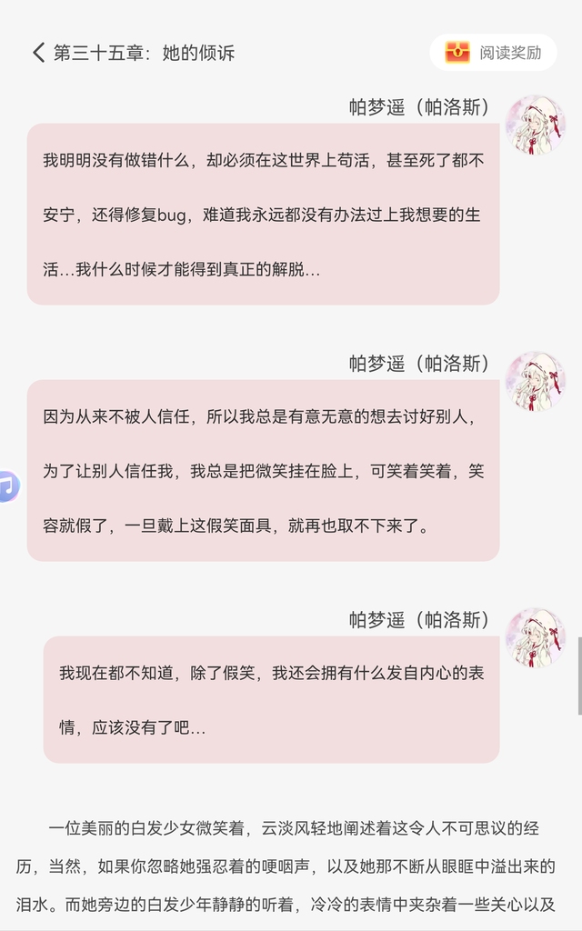 帕梦遥(帕洛斯)(环顾着眼前熟悉的地方)难不成,我的修bug之旅失败了,所以导致我脱离了bug世界。如果是这样,那么刚才所发生的一切就说得通了,那些记忆与痛苦很可能是脱离世界所携带的必要条件