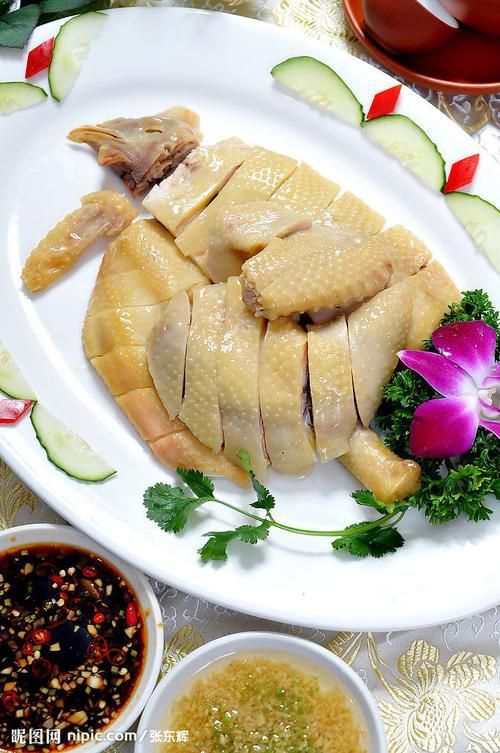 白斩鸡形状美观,皮黄肉白,肥嫩鲜美,滋味异常鲜美,十分可口,肉色洁白皮带黄油,具有葱油香味,葱段打花镶边,食时佐以姜蓉、蒜泥、酱油,保持了鸡肉的鲜美、原汁原味,食之别有风味。