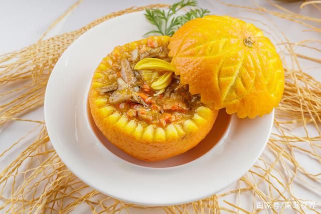 将酿好的橙放盘中,上笼屉蒸30分钟取出上席。食用时,用小银匙伸入橙中舀起进食。