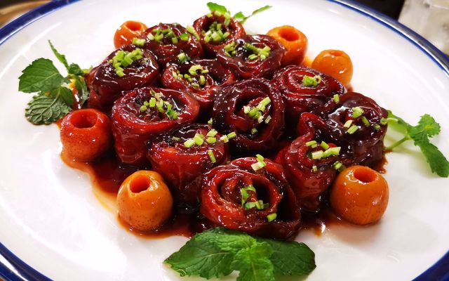 九转大肠是中国山东省济南市的传统名菜,属于山东菜系。以猪大肠为主料,加以葱、姜、芫荽等配料,通过煮、烧等烹饪技法制作而成,成菜后有辣觉,并且酸、甜、香、咸四味俱全,色泽红润,质地软嫩。