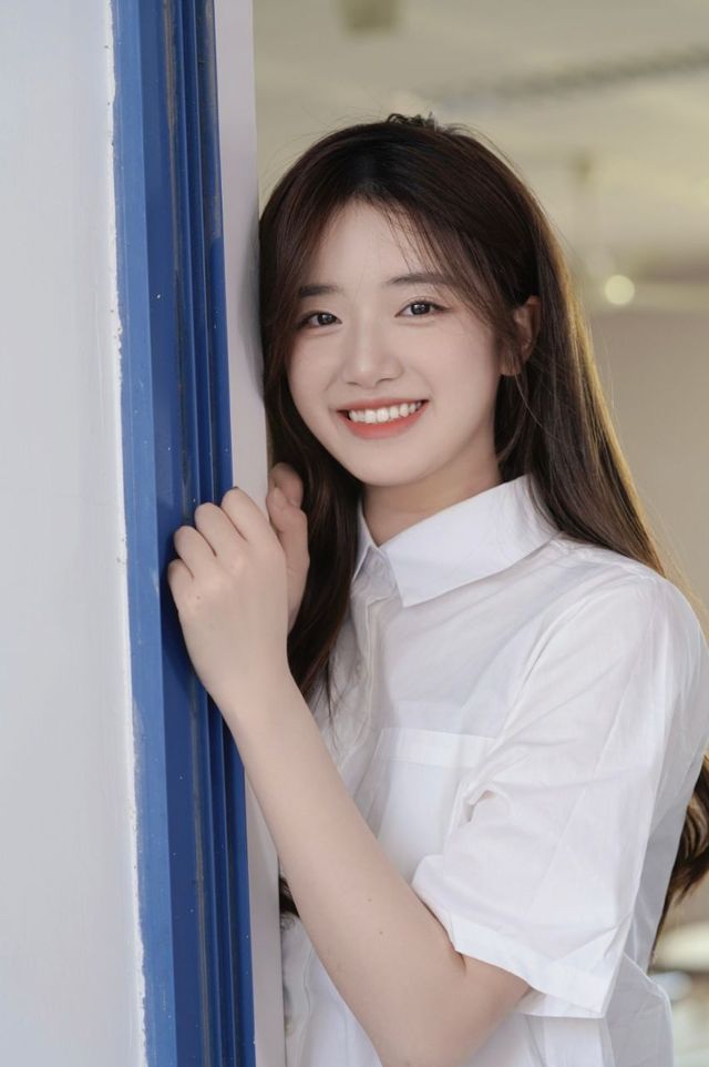 少女穿着白色的衬衫搭配小短裙趴在门上有种清纯校园女神的视感,