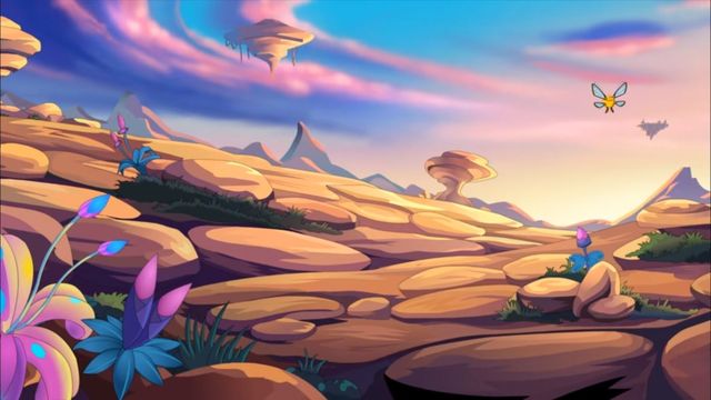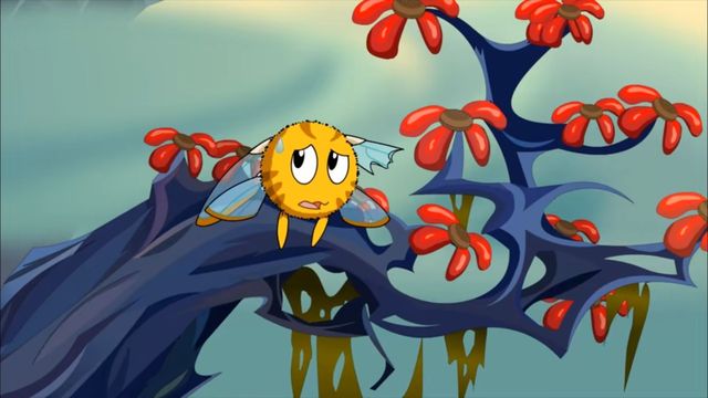 忽然不知道是哪儿来的狂风,把小精灵吹出老远,小精灵立马咬住花蕊,才使自己不会被吹飞