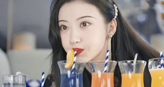 女孩面前摆了一排各种颜色的饮品,她目光新奇地挨个试着,不时露出满足的表情。