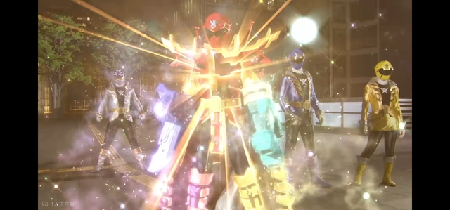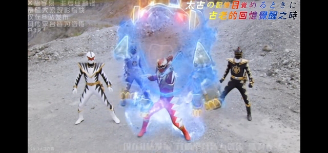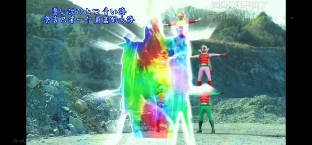 随后5人一起搭建五骑士塔,从上到下把力量集结在一起,面前形成一道厚重的彩色能量屏障。