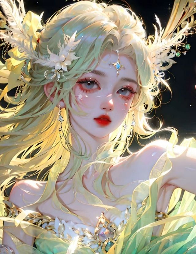 出现在四人面前的是一个留着淡绿色头发的仙子,她身穿的碧绿裙子都有着金色花边装饰,额前是一颗蓝色宝石的吊链,胸前更是雕刻着一颗花苞形状的玉石。头上的金色皇冠有着花朵的元素。