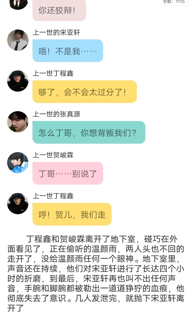 宋亚轩害怕的抱着膝盖,缩在角落里,温颜雨也有一些诧异,但更多的是猖狂,她蹲下身去靠近宋亚轩,使劲的捏着宋亚轩流着血的肩膀,宋亚轩就任她欺负,也不敢反抗了,因为他已然发现自己怀有一个小生命(私设!私设!切勿当真!)。画卷外,几个人看到这段画面时都忍不住哭了,一个个都想挣脱束缚,将温颜雨捏碎。