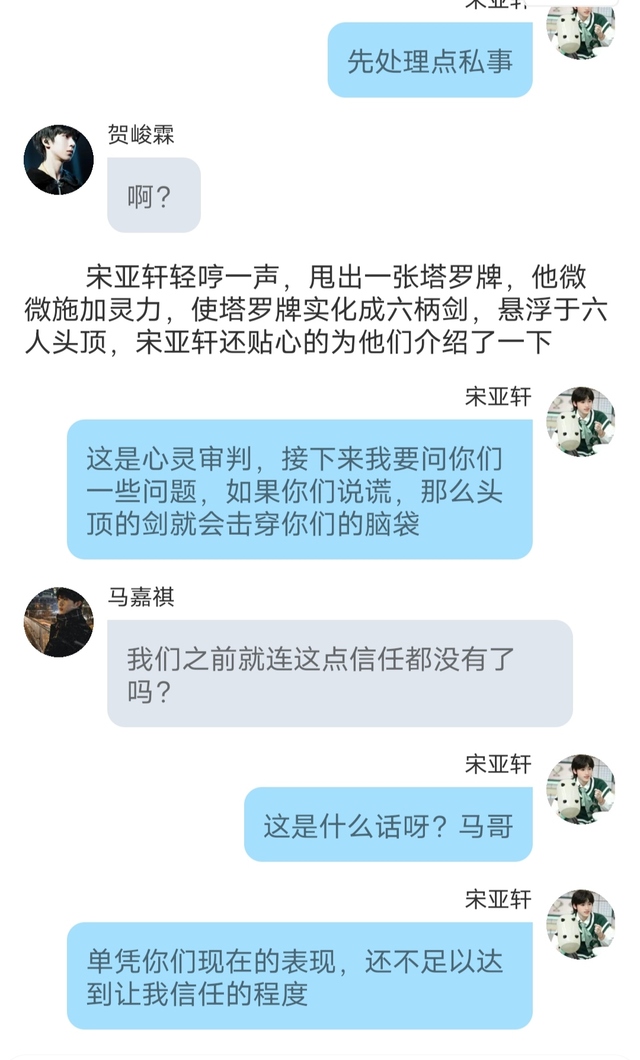 宋亚轩抬眼看着他们头顶上的宝剑,只是微微晃动了一下,并没有出现任何异常,这就意味着他们并没有说谎。宋亚轩有些尴尬,但更多的还是烦躁,这温颜雨每次都要来给他心里添堵