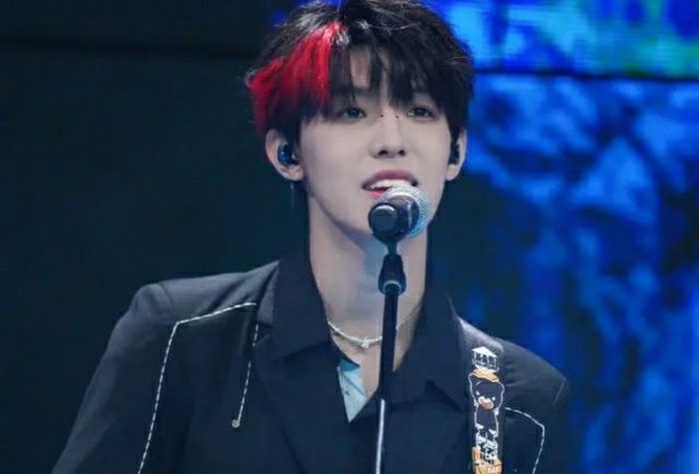 张泽禹一身黑色的外套出现在舞台的中央,或许是为了配合今天要演唱歌曲的主题,他特意将额前的刘海挑染成了红色。