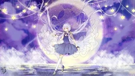 白色的短发,紫色的短裙,身后的白色月亮,看着她格外美丽