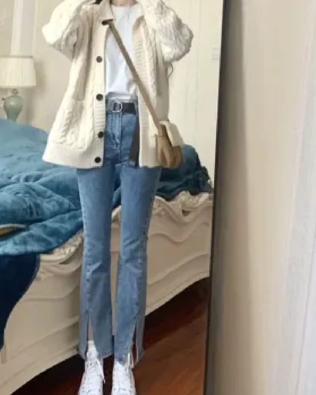 林念念今天穿的很漂亮,牛仔喇叭裤把林念念原本纤细的腿衬托的更加纤细,白色上衣加奶白色的外套一看就能让人喜爱,身上的斜挎包更加突出了林念念的清纯。