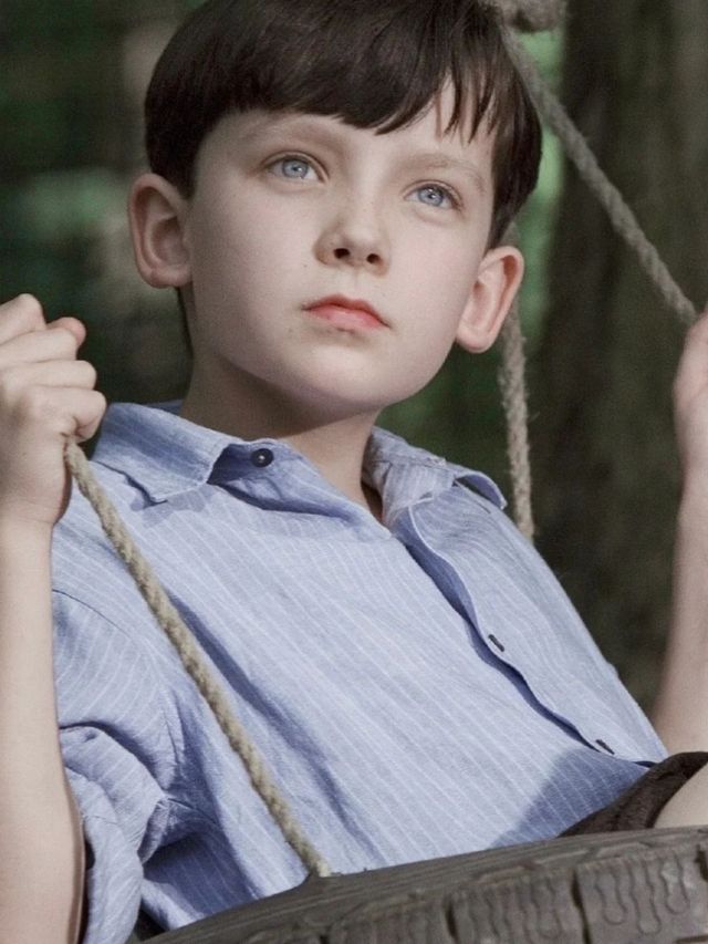 花园里一个男孩儿坐在秋千上看着远处的风景。