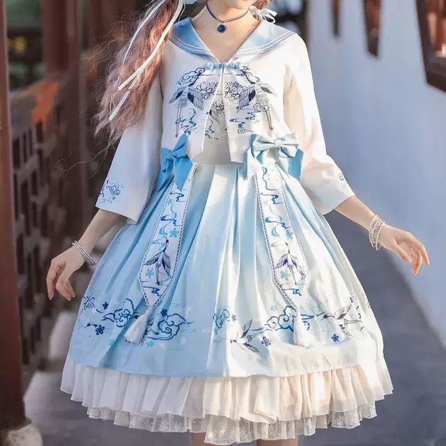 暮星洛今天穿了一件,精致的国风洛丽塔。她一头白色的长发扎成了鱼尾辫,上面别了一只蓝色的蝴蝶。她的脚上穿着一双蓝色的海洋一样的皮鞋。