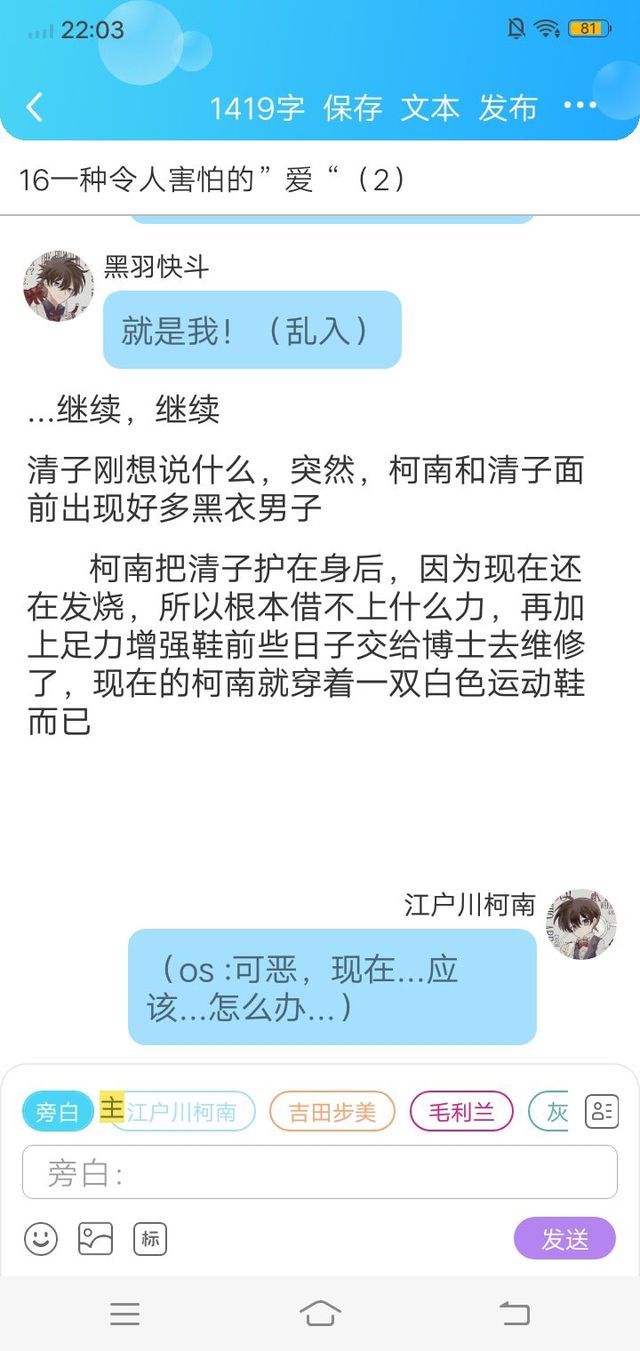 黑羽快斗是这样啊,你的父母是小侦探现在所在调查的黑衣组织的成员,前些日子调查了我和小侦探,所以才知道我们俩的真实身份,然后呢,你的父母由于想背叛组织,所以被杀了,当时的你也才2岁,被父母放在一个胡同里,之后,这个山村圭柒就出现了,收养了你,对你都很好,但唯独就是感情上不会让你去根据自己的所向往的去走,怕你后悔,可是有一天,你的养父看上了一个长得特别好看的小男孩,便开始演这种戏,以此来骗取更多的好看的男孩子,对吧