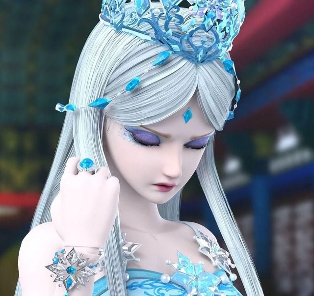 镜子里,映照出来一个浑身上下充斥着冷冽气息的女子——一张清冷的脸庞,微微睁开的湛蓝色双眸,皮肤细腻无暇,刘海从中间分开,额中央镶嵌冰蓝色菱形冰晶,银白色长发在身后笔直垂至足踝,发尾还挂着冰晶链。