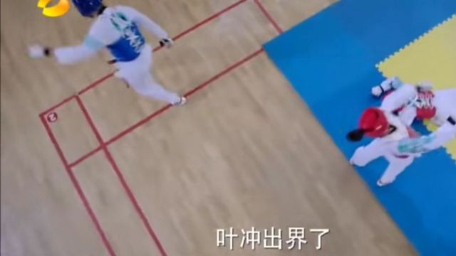主持人:刚才范晓萤向叶冲攻击的时候虽然失手了,但范晓萤奔跑的惯性,把叶冲撞出了界外