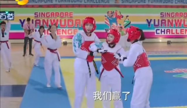 主持人:多少年来,真是前所未有,观众朋友们,岸阳松柏道馆队战胜了卫冕冠军:新松柏道馆队,最终获得了本届元武道三人挑战赛新加坡站的冠军