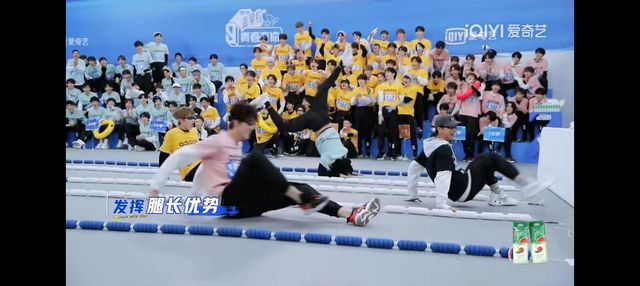 他是第一棒,以翻跟斗的技术遥遥领先。