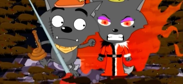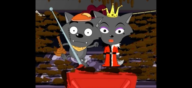 拉远镜头,我们看到狼堡里被老鼠站满了空间,墙上,电视上,到处都跑着老鼠,红太狼火冒三丈的对灰太狼说道:’都叫你不要在家里乱吹了吧,把老鼠都叫来了”灰太狼被红太狼打出了狼堡,红太狼也被老鼠挤出了狼堡,只见狼堡的窗口,凡是有出口的地方,都涌出了好多好多的老鼠,密密麻麻的老鼠从狼堡里出来,吓的红太狼都跳了起来。