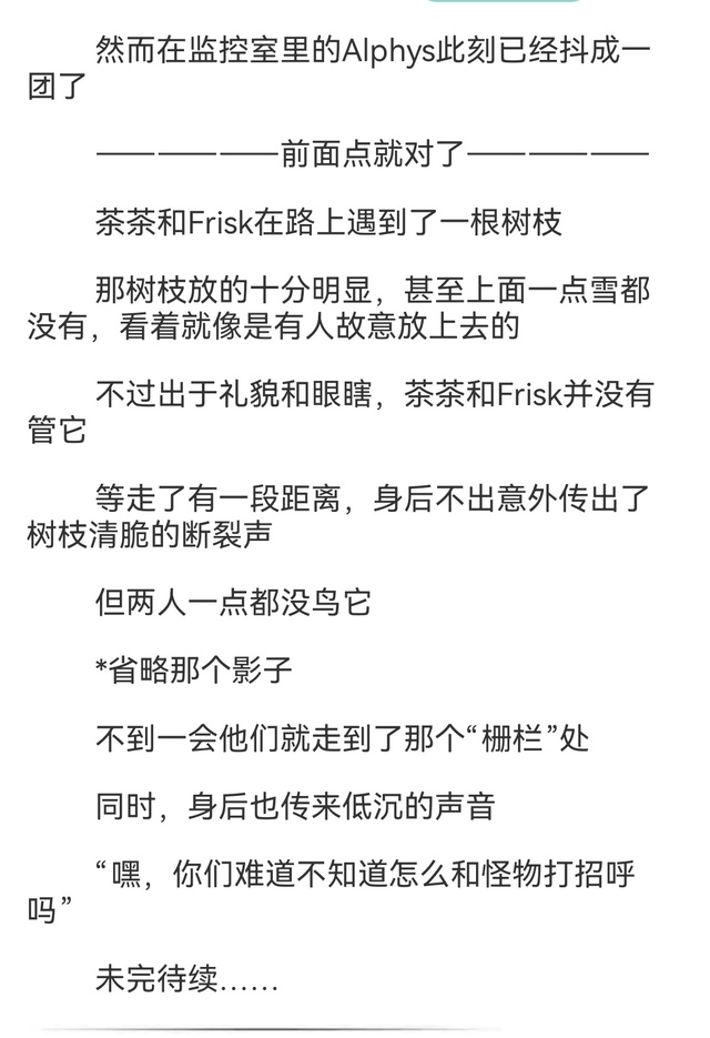 突然!茶茶感到道路在剧烈地振动,惊恐之下,茶茶抬起了头,发现Frisk正以100km/h的速度滑过来,这个速度甚至都超越了小明他奶奶