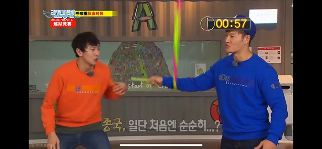 导演组对方嫌疑犯转动呼啦圈同时在转动的事物上队员全员像义气游戏那样分开吃就行