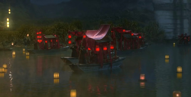 夜幕降临,河边热闹非凡,暖黄色的河灯漂浮在河流上,载着新娘的船只终于驶来。