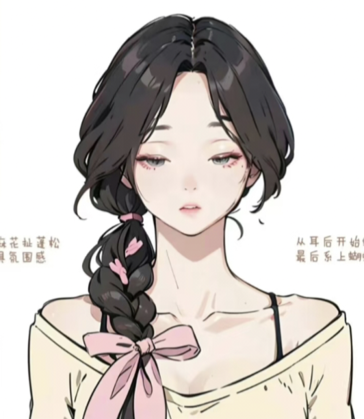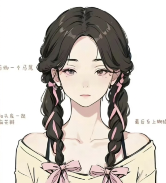 许愿的双麻花辫从两侧耳后悄然起始,用粉色丝巧妙地融入其中,与柔顺的发丝相互交织,直到发尾,以一只较大的粉色蝴蝶结收束,为她平添了几分灵动的甜美气息。