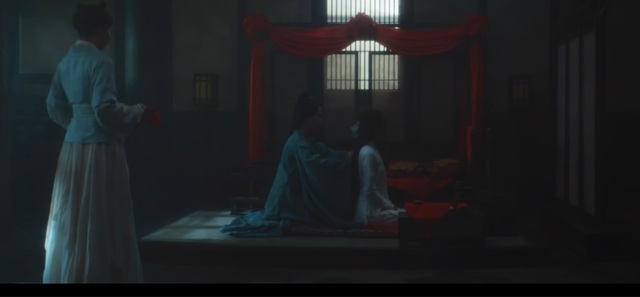屋内,一少女端坐,身后的妇人正在为其梳洗打扮。她们似乎在讲述着什么