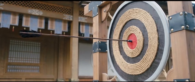 随着大鼓被敲响,场上的少年们纷纷自箭篓里抽出一根箭,箭的尾巴還有相對應每個人不同的顏色,他们缓缓地拉弓上弦,眯着眼睛瞄准把心,最后纷纷射出自己的第一箭