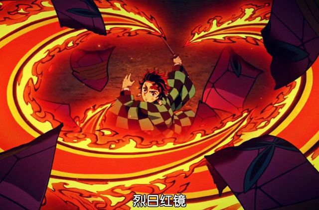 炭治郎一瞬间向前方划出一道大范围的火焰斩击,这半圆形的斩击竟然一瞬间把前方三道所有腰带斩断!