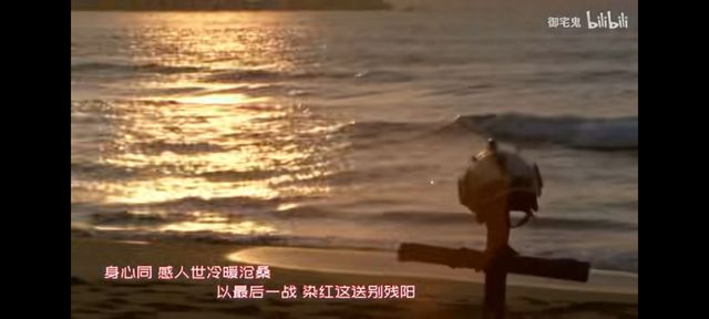 (在夕阳下海边一个十字架上面放着一个帽子;其他人在夜色降临前渐渐的走了;变成杰克在夕阳下好似在诉说着什么。)