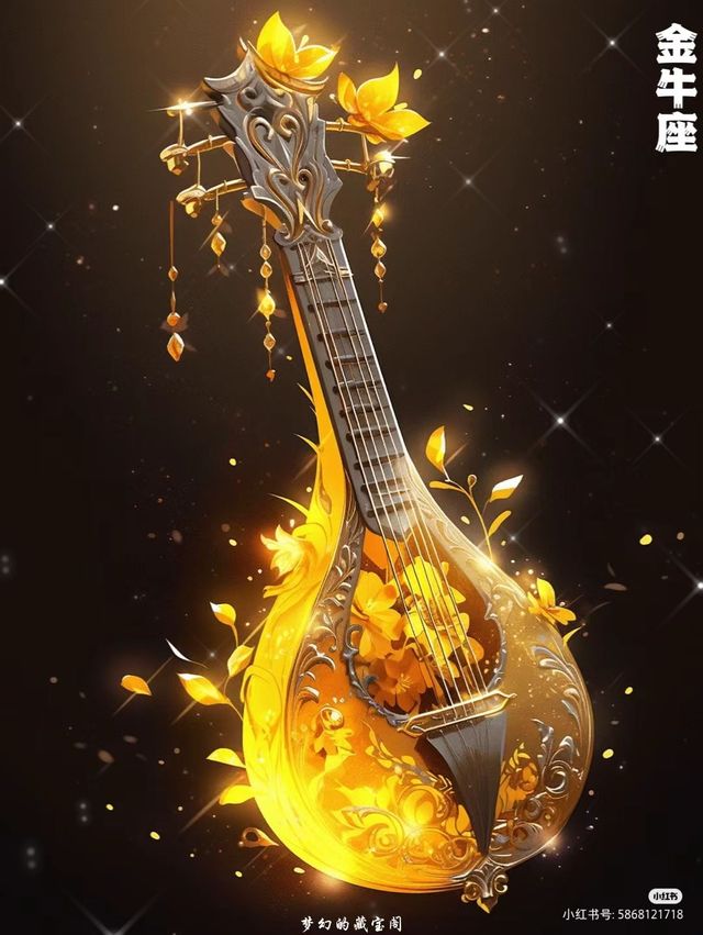只见未来召唤出一个整体颜色是金黄色的琵琶而且琵琶的周围还有许多的美人蕉,琵琶的整体材质是有黄色的水晶制作而成,琵琶的周边还有银色情人节的花纹