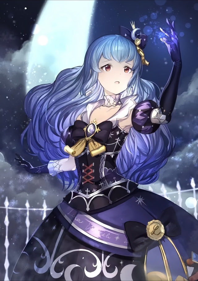 发饰依旧是有一个显眼的月亮标志。是一个月亮挂饰扣在暗蓝色的蝴蝶结上。月亮上还有一个小小的皇冠。上衣裙子是两件套。以暗紫色和墨蓝色为底色。