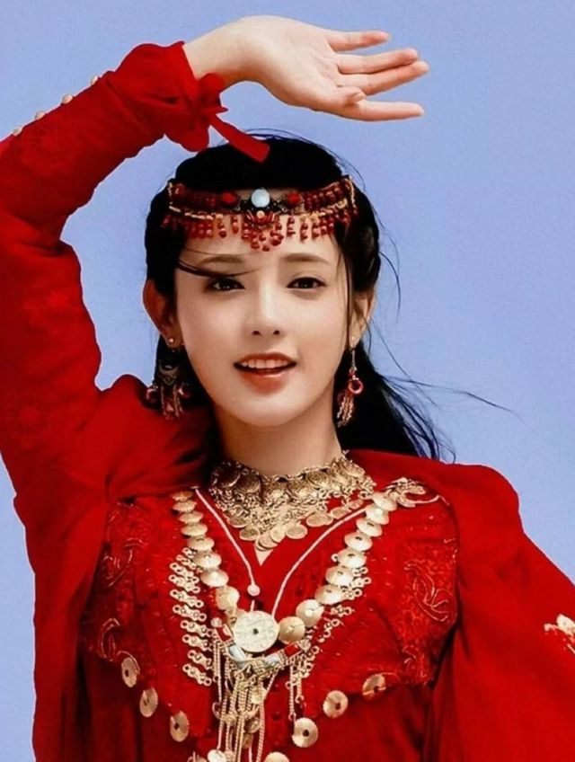 身着红色衣裙,长及曳地,细腰以云带约束,更显出不盈一握,额间一抹红珊瑚宝石,映得面若芙蓉。面容艳丽无比,一双凤眼媚意天成,却又凛灵动人,一头青丝梳成华髻,繁丽张扬,那小指大小的明珠,莹亮如雪,星星点点在发间闪烁,