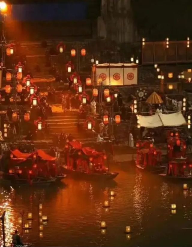夜幕降临,太阳沉入山峦间。宫门大门高耸在一面陡峭的山崖之上,大门面前是四通八达的水域,所有到来的货物、旅人和商贸货船都停靠在此处码头卸货、交易。四通八达的水系两岸,还有不少贩夫走卒,密织的河网停着各种各样载满货物的船只,上面堆满了布匹、水果、鲜花、蔬菜和肉食。与往日不同,此刻水面上还多了很多装扮着红绸彩灯的花舫,灯笼晃晃地飘荡着,灯笼下面坠着随风而动的绣幡。