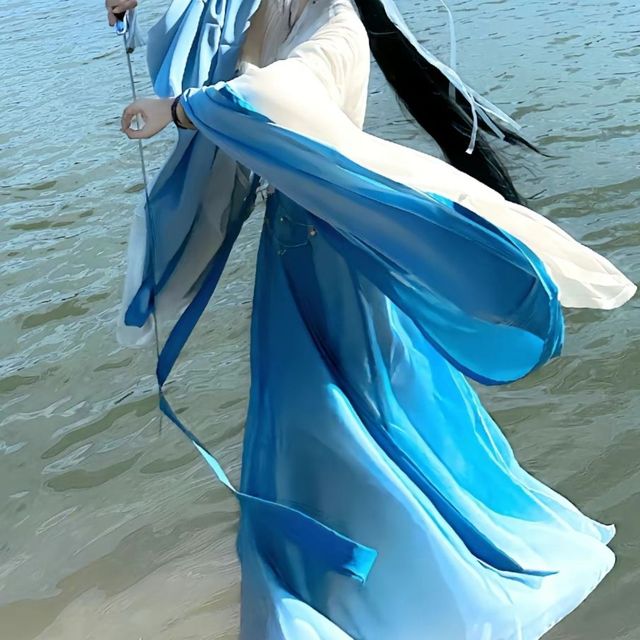 这身衣服以蓝白为主,右手握着一把剑,代表着。舞者所跳之舞其实是以剑术而改