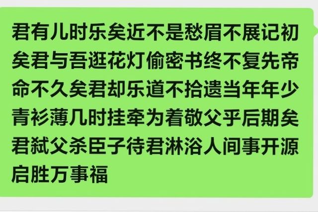 君之童年欢乐犹在,如今未闻愁绪。忆往昔,君与吾共赏花灯,私订终身之约。然时光荏苒,先帝之命已逝。君仍笑谈往事,不恋权位。当年少年,身着青衫,何时牵挂之情因尊敬父亲而迟来?君弑父、诛臣子,待君沐浴人世的恩泽,开启胜利之路,万事皆福。