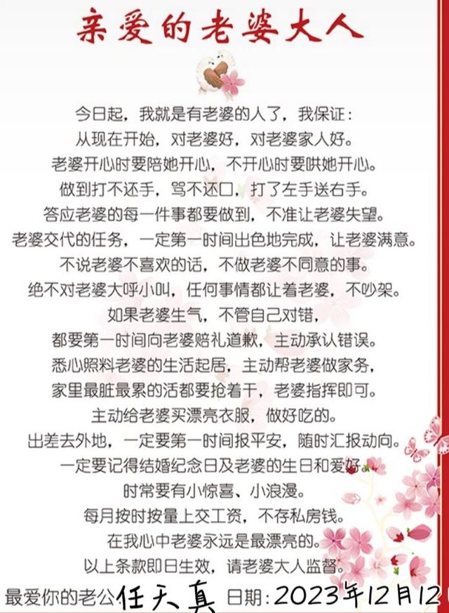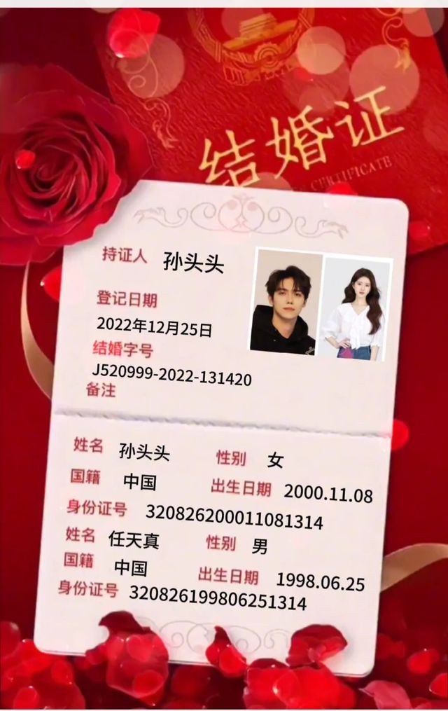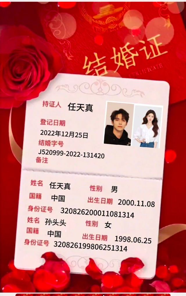 任天真执子之手,与子偕老我们领证 啦,从此一个人变成一个家, 愿多年以后,不忘初心, 相爱如初,我宠你像小公主让你感受到家的温暖两姓联姻,一堂缔约,良缘永结,匹配同称。看此日桃花灼灼,宜室宜家,卜他年瓜瓞绵绵,尔昌尔炽。现仅以白头之约,书向鸿笺,好将红叶之盟,载明鸳谱。余生,请多多指教任太太我们领证了