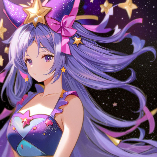 此时她的形象再次发生了变化,头上的发饰变成了星星,衣裙上的装饰变成了不断闪烁光芒的各色星空。