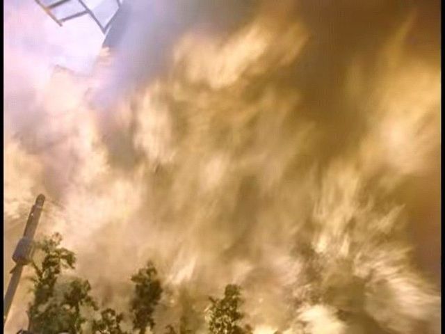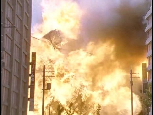 街道上,几栋楼房突然爆炸,地上裂开喷出地狱之火。(原剧情中是k1地区发生大爆炸)