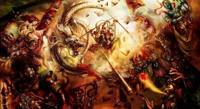 孙悟空二话不说直接开启三头六臂,一手一个金箍棒,王灵官执金鞭打来,孙悟空毫无惧色,手中金箍棒左遮右挡,后架前迎,没有一点漏洞,逼的雷将与王灵官不得相近。