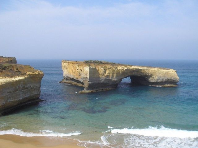 工作人员:“In the past, this rock was a cape that protruded from the sea and connected to the land. Due to the erosion and erosion of the waves, it formed two circular holes, forming a double arch shape, so it was named "London Bridge".”(从前这个岩石是突出海面与陆地连接的岬,由于海浪的侵蚀冲刷形成2个圆洞,正好成双拱形,所以起名为“伦敦桥”。)