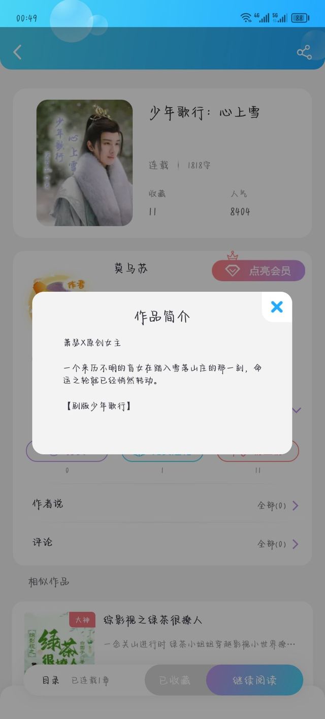 莫乌苏开了本新书,《少年歌行:心上雪》原创女主cp萧瑟