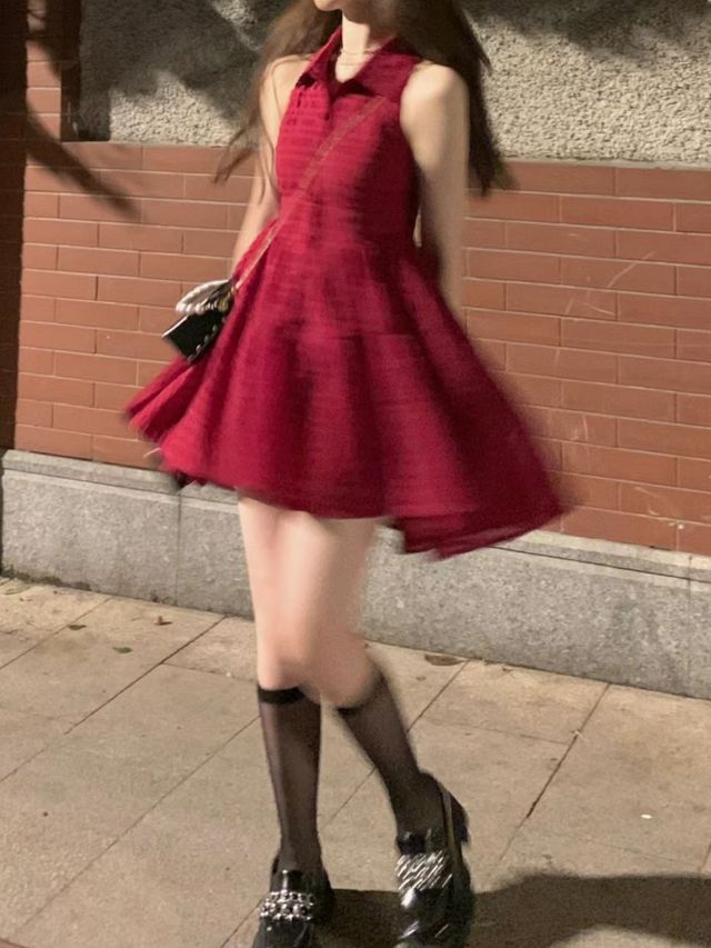 她穿着酒红色的裙子和小黑靴子离开