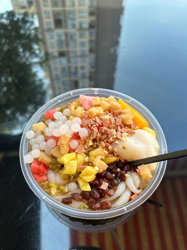 说着,你从一碗冰粉中挖了一勺递到他面前