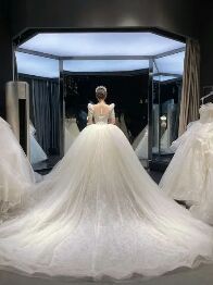 换好后,我站在那个台子上。服务员帮我摆弄婚纱摆尾