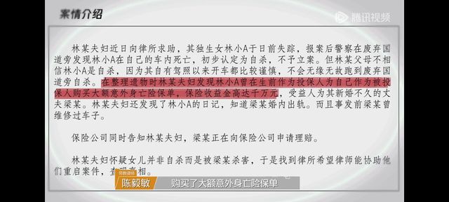 陈律:但林某夫妇呢,不相信林小A是自杀……然后在整理遗物的时候,林某夫妇发现林小A曾在生前作为投保人,为自己作为被投保人