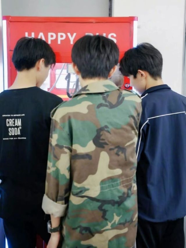 中途休息,三个少年围着一个饮料机。